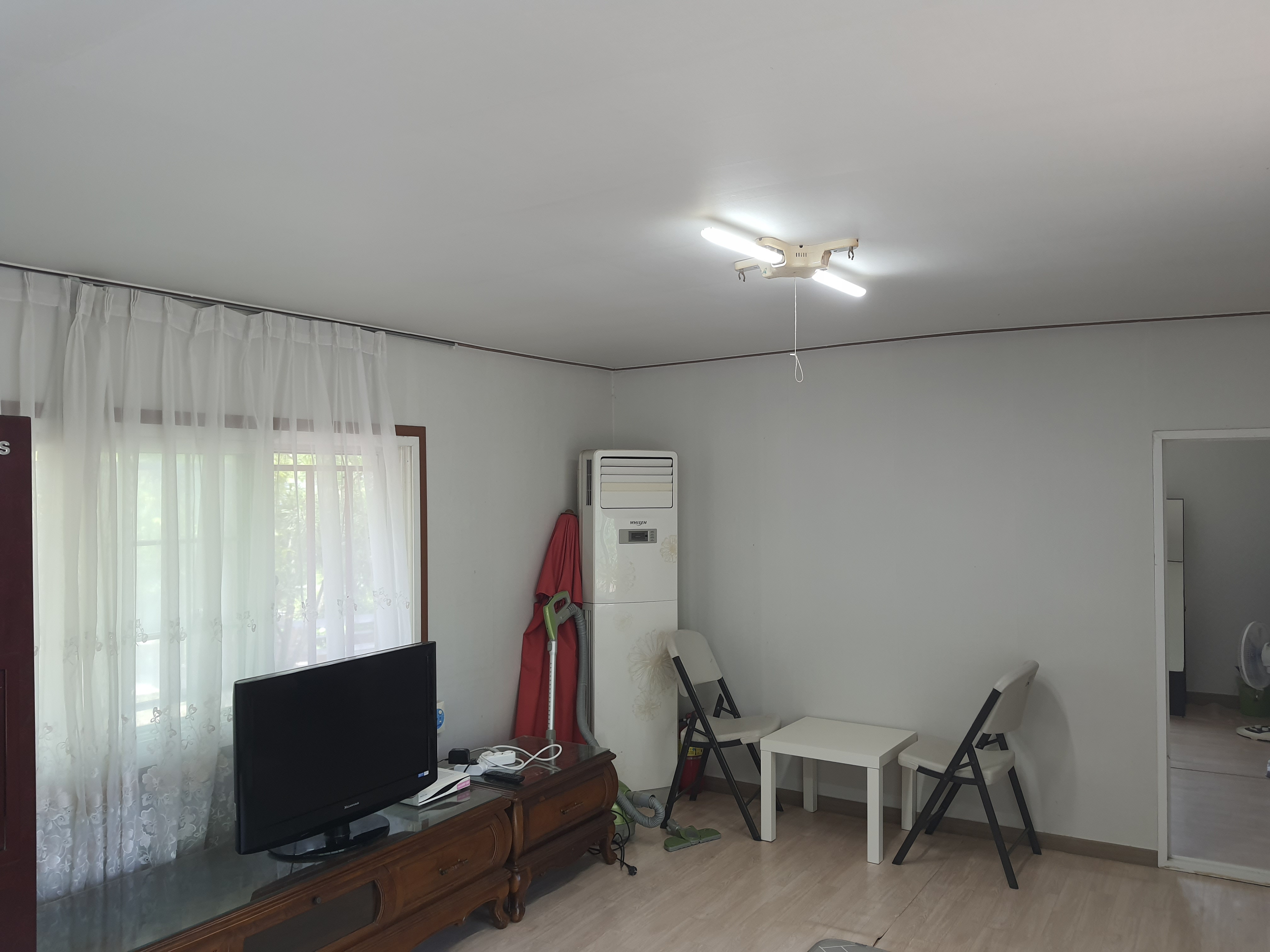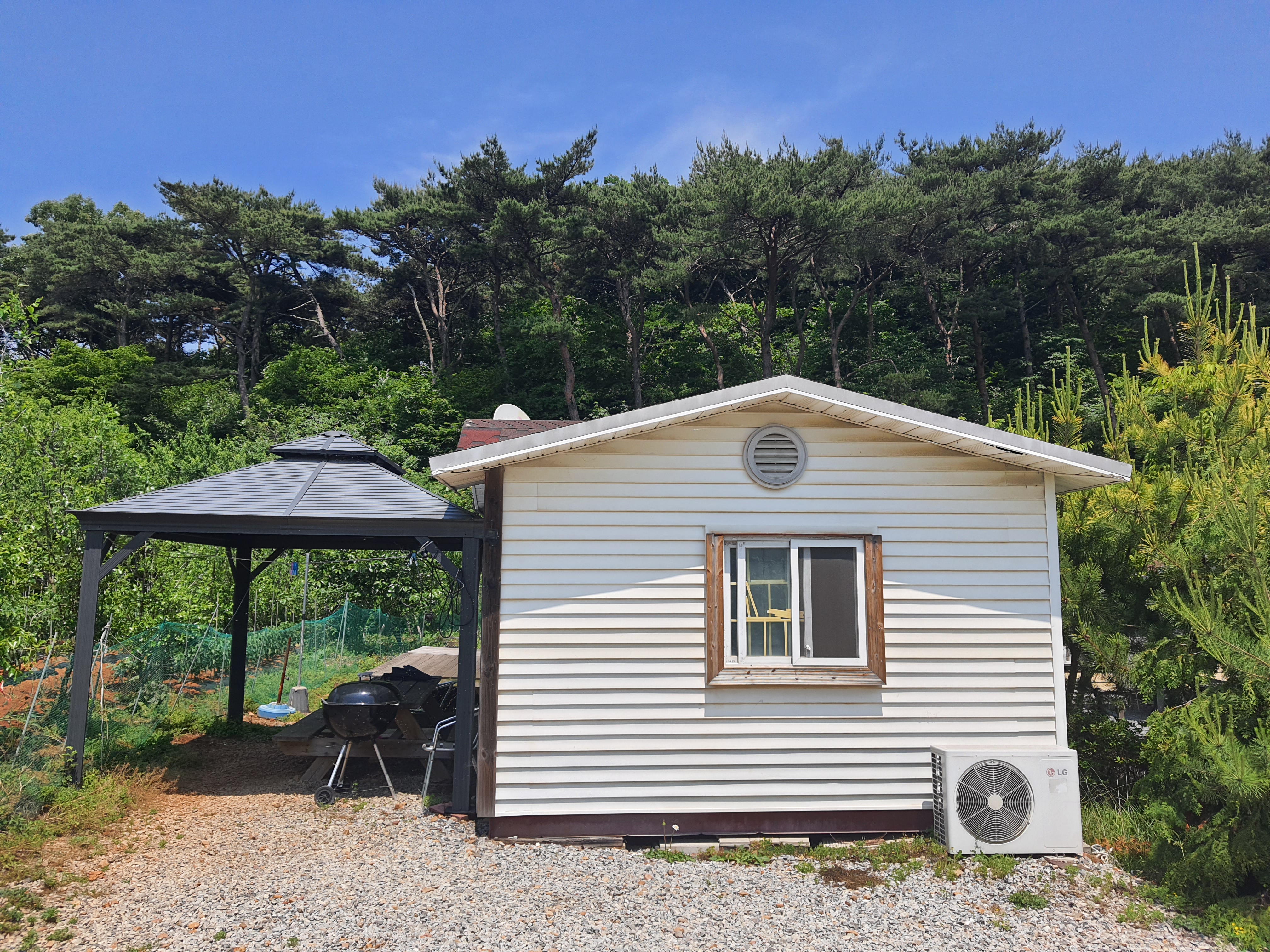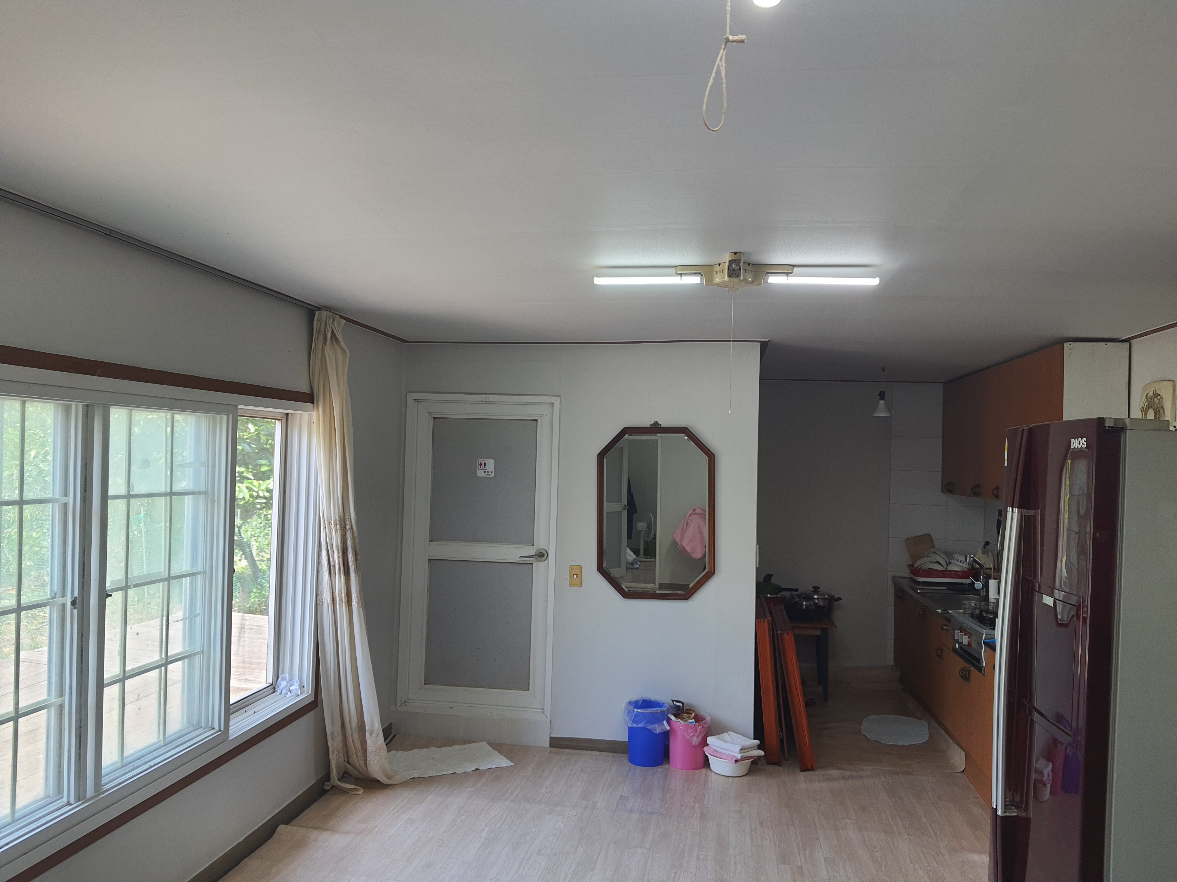 독립별채: 12m x 4m, 15평 / 큰방1 (침대) + 큰마루1 + 화장실 + 주방